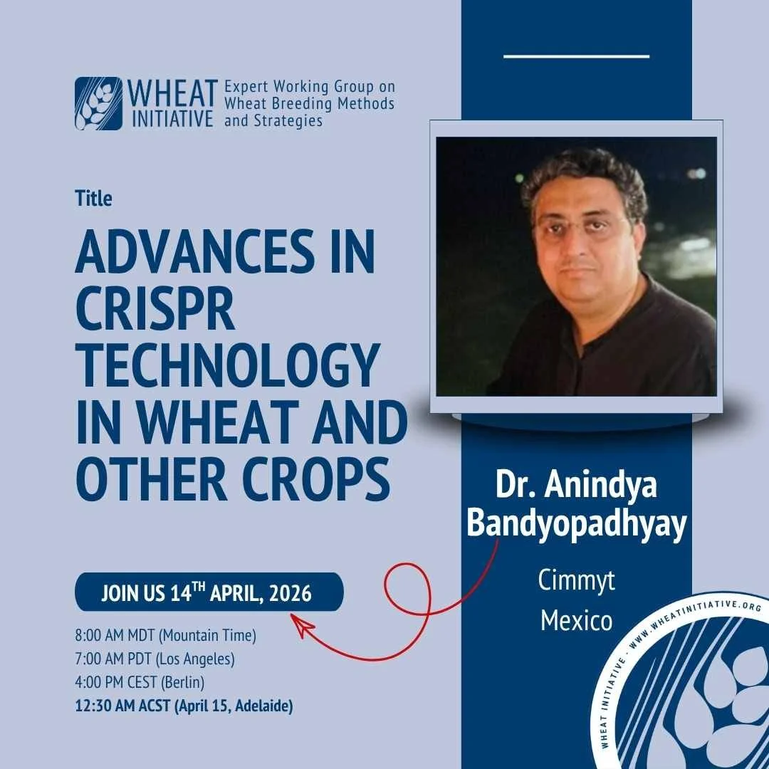 The Expert Working Group on Wheat Breeding Methods and Strategies presents a webinar on Advances in CRISPR Technology in Wheat and Other Crops with Anindya Bandyopadhyay (CIMMYT, Mexico). Join in online on April 14, 2026! Find all information here: